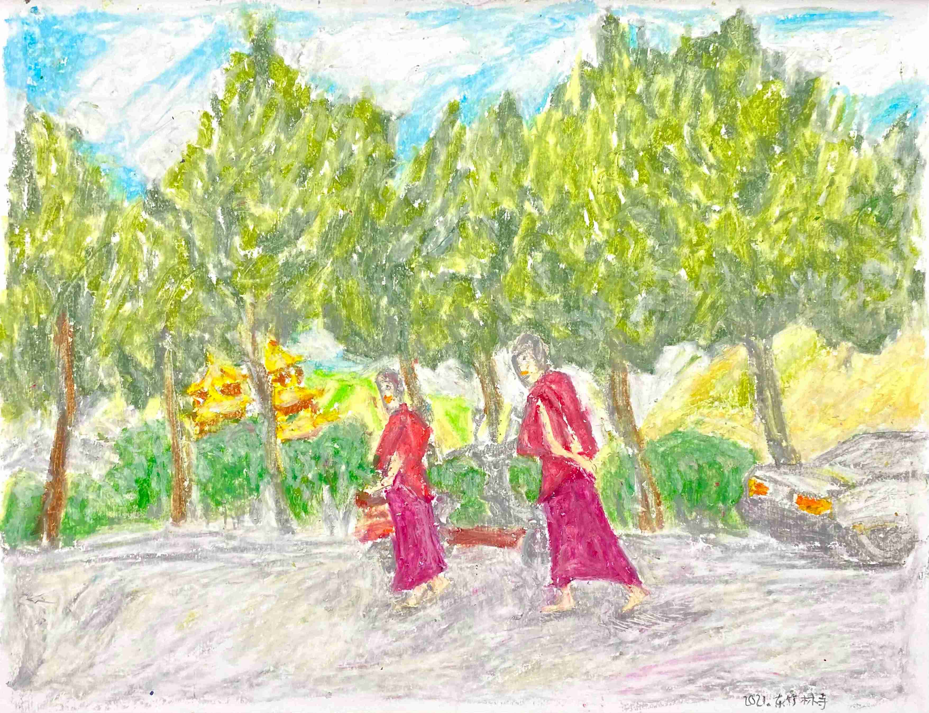 14 曹应斌 东竹林寺的僧侣 纸上油画棒 23x30cm 2021_8 -