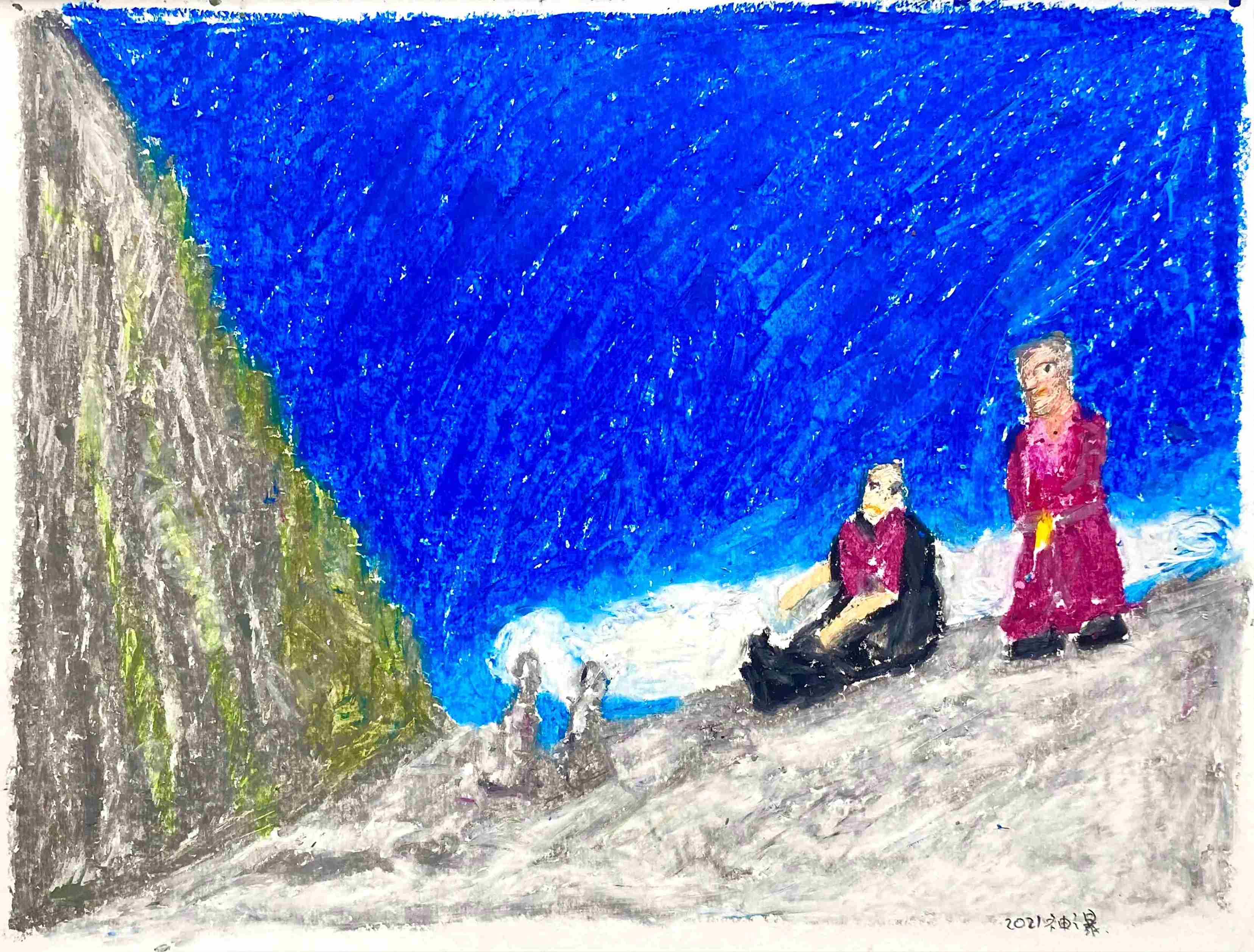 16 曹应斌 神瀑的僧侣 纸上油画棒 23x30cm 2021_10 -